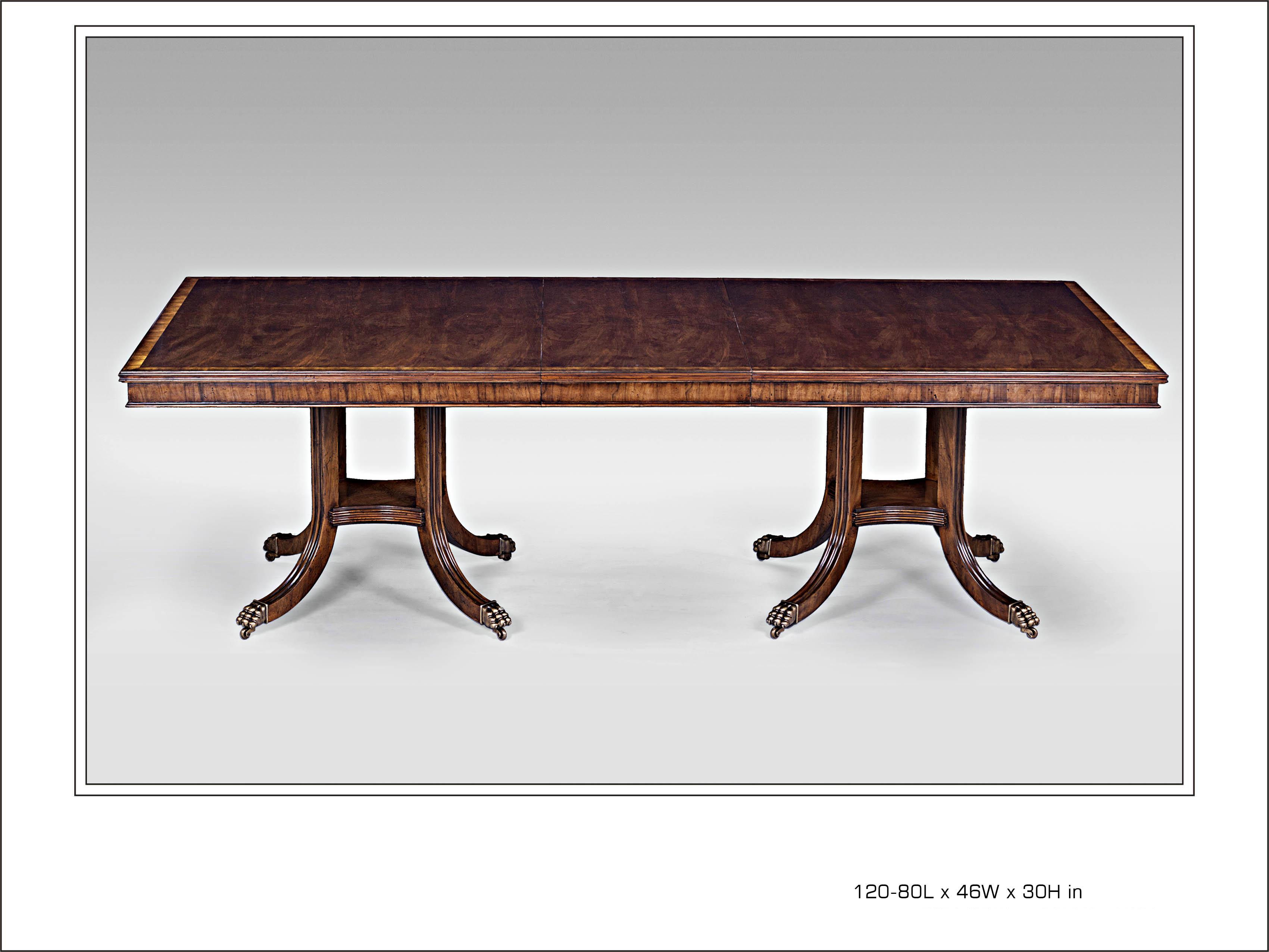 Swirl Walnut Double Pedestal Dining Table with Two Removable Leafs and Brass Casters