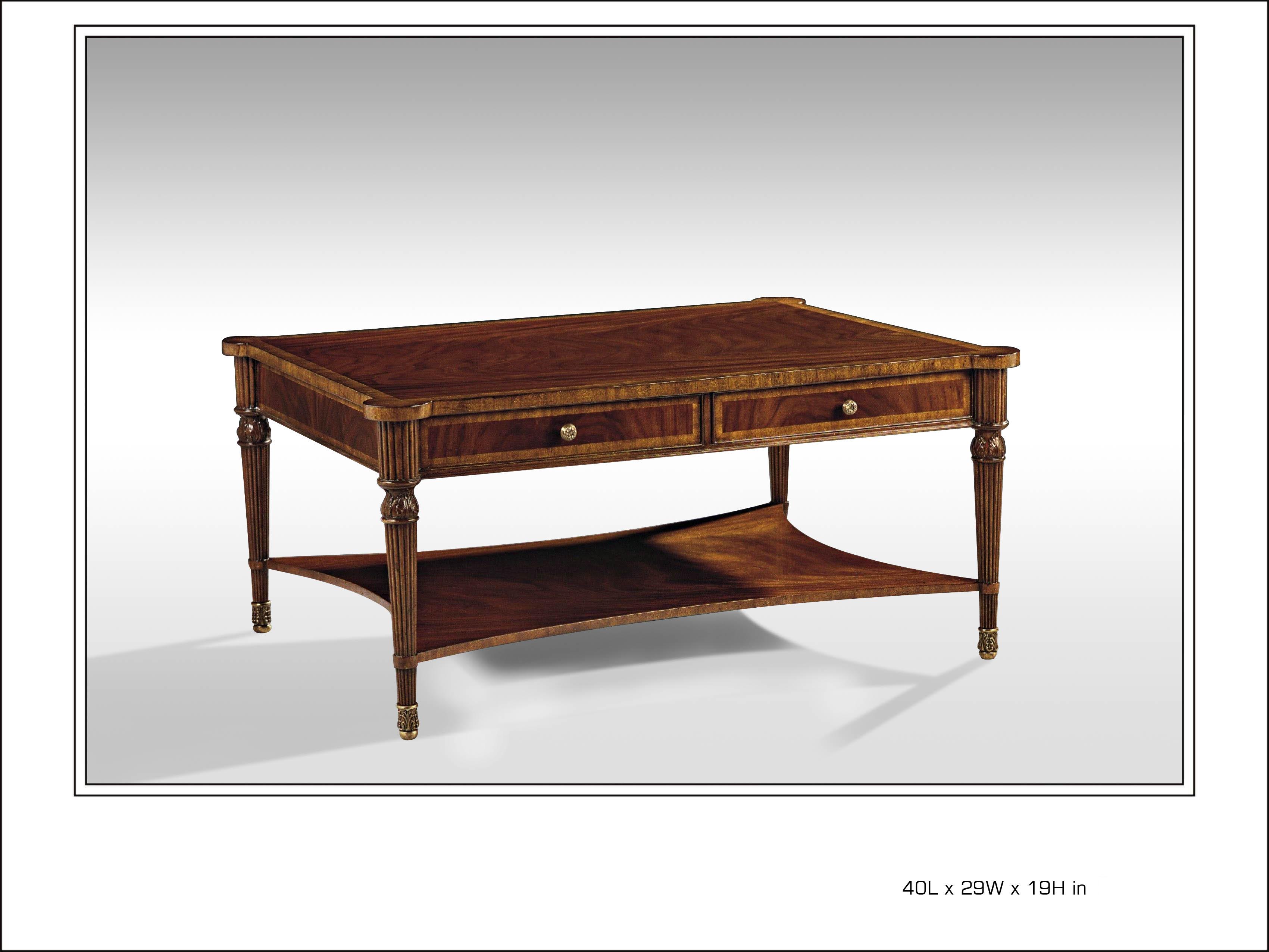 Crotch Mahogany with Movengue Banding Cocktail Table with Brass Accents and Four Working Drawers. Available in Walnut.