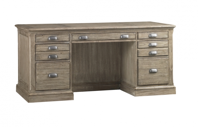 62" Pedestal Desk with Gray leather top. Left side facing: 3 locking drawers (1 full extension file drawer will accommodate legal/letter size files) Center: Drop-front keyboard drawer with ergonomic palm rest); 2 adjustable shelves;