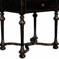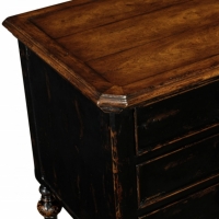 Planked walnut and black "rub-through" finish square three drawers chest or bedside table with tapering baluster legs and X-frame under-tier inspired by Northern Italian country furniture.