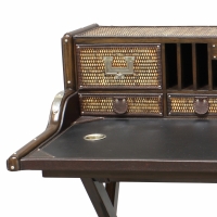 Mahogany wood frame and legs. Buffalo leather on the writing surface and sides. Cane matting on the drawer faces, top, and back. Round cut out on writing surface for electrical cords. Brushed nickel hardware on upper drawer and sides. Buffalo leather tab pulls on lower four drawers. Base is removeable and folds.
