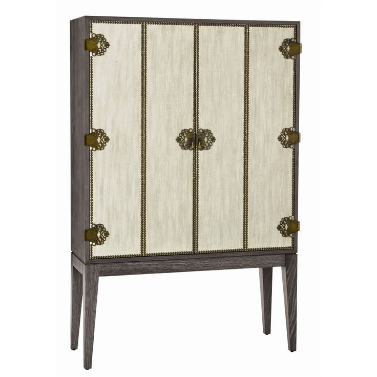 Wood bar/cabinet in a veneered gray limed oak finish features a pair of bi-fold natural linen doors with nailhead trim and ornate antiqued brass hinges. Interior features mirrored back with recessed light, 3 adjustable shelves and 2 drawers.