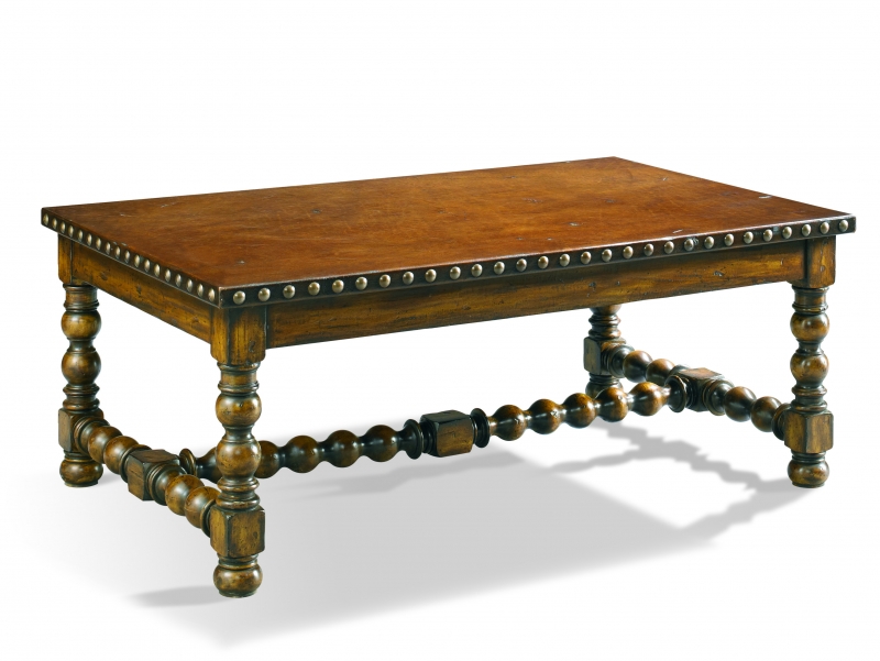 This rectangular cocktail table has an antiqued wood base with elaborate turnings and an aged brown leather top with antique brass, oversized spaced nailhead trim.