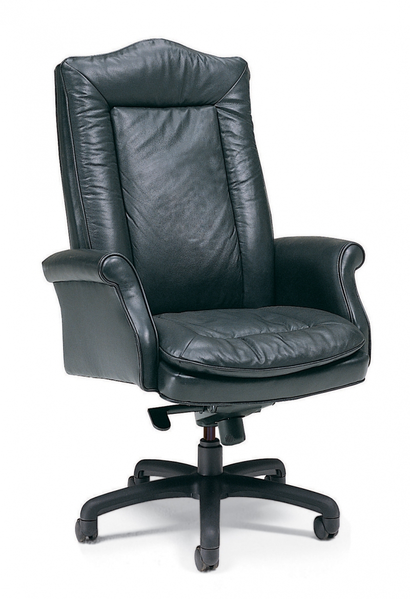 Fully upholstered high back swivel chair with envelope back and Seat. Special knee tilt base and gas lift. Available with wood base as well.