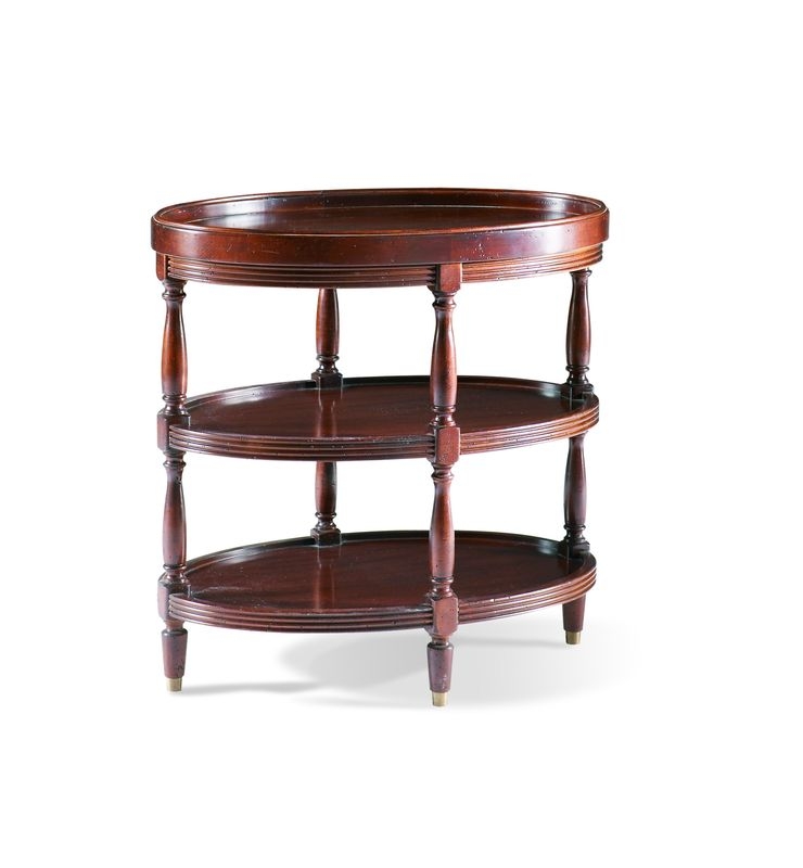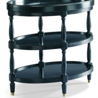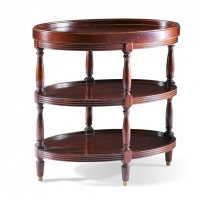 Three tiered lamp table with a slightly raised apron treatment around each shelf and top.