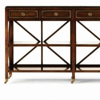 Four liner pads, middle shelf has two glass inserts, wood bottom shelf, brass casters.