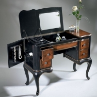 Hand painted finish on selected hardwoods and wood products. Choice cherry veneer on top, front apron and drawer fronts. Side doors open for jewelry storage. Top sides open to reveal felt lined sections. Top center with mirror opens to reveal felt lined compartment. Four felt lined drawers with antique brass finished hardware.