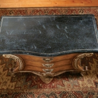 Selected solid woods and wood products. Resin components and accents. Fossil stone veneer top with inlaid brass border. Three drawers with antique brass finished hardware.