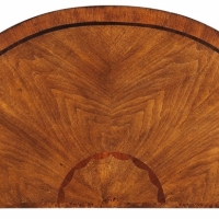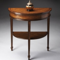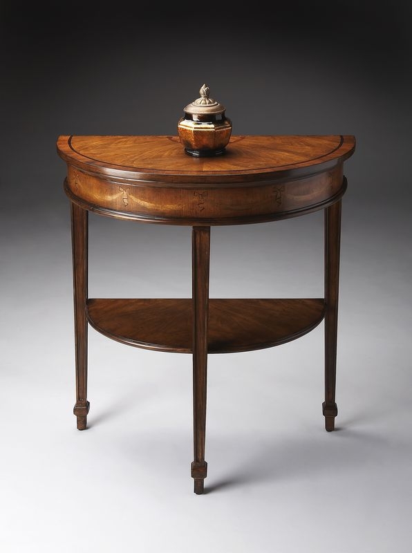 This eye-catching demilune console has an elegant top with cathedral grain crown cherry veneers and an inlaid maple veneer border. The bow and ribbon inlay on the cherry veneer apron makes this console like none other. The Pembroke legs are made from gemelina hardwoods.