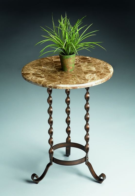 Elegant table with metal frame construction and marble. Features a round marble top with a warm bronze finished metal base.