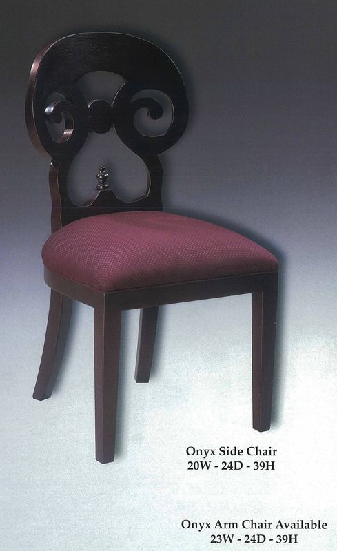 Onyx side chair available in various finishes and fabrics. Arm chair available.