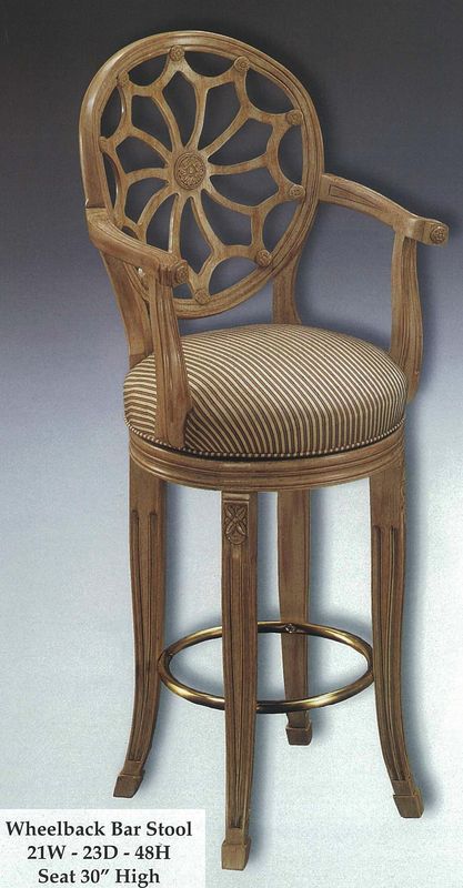 Wheel back barstool available in various finishes and fabrics. Available without arms.