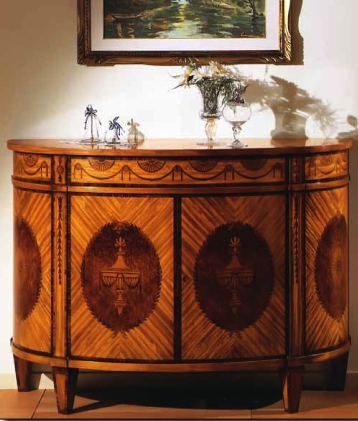 Demi-lune cabinet in satin wood and mahogany marquetry inlay. Center drawer with storage shelf behind doors.