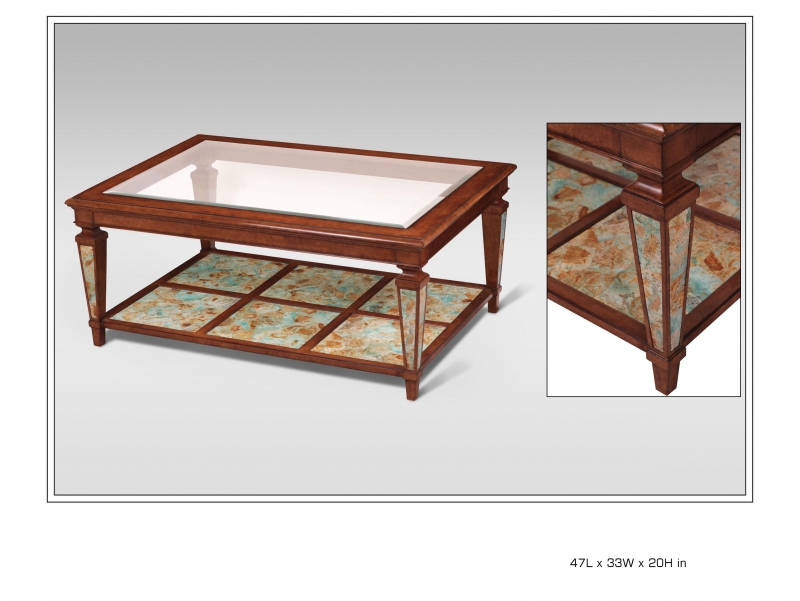 Sahara Finish Rectangular Cocktail Table with Crazy Cut Turquoise Stone Inlay and Bevelled Glass Top