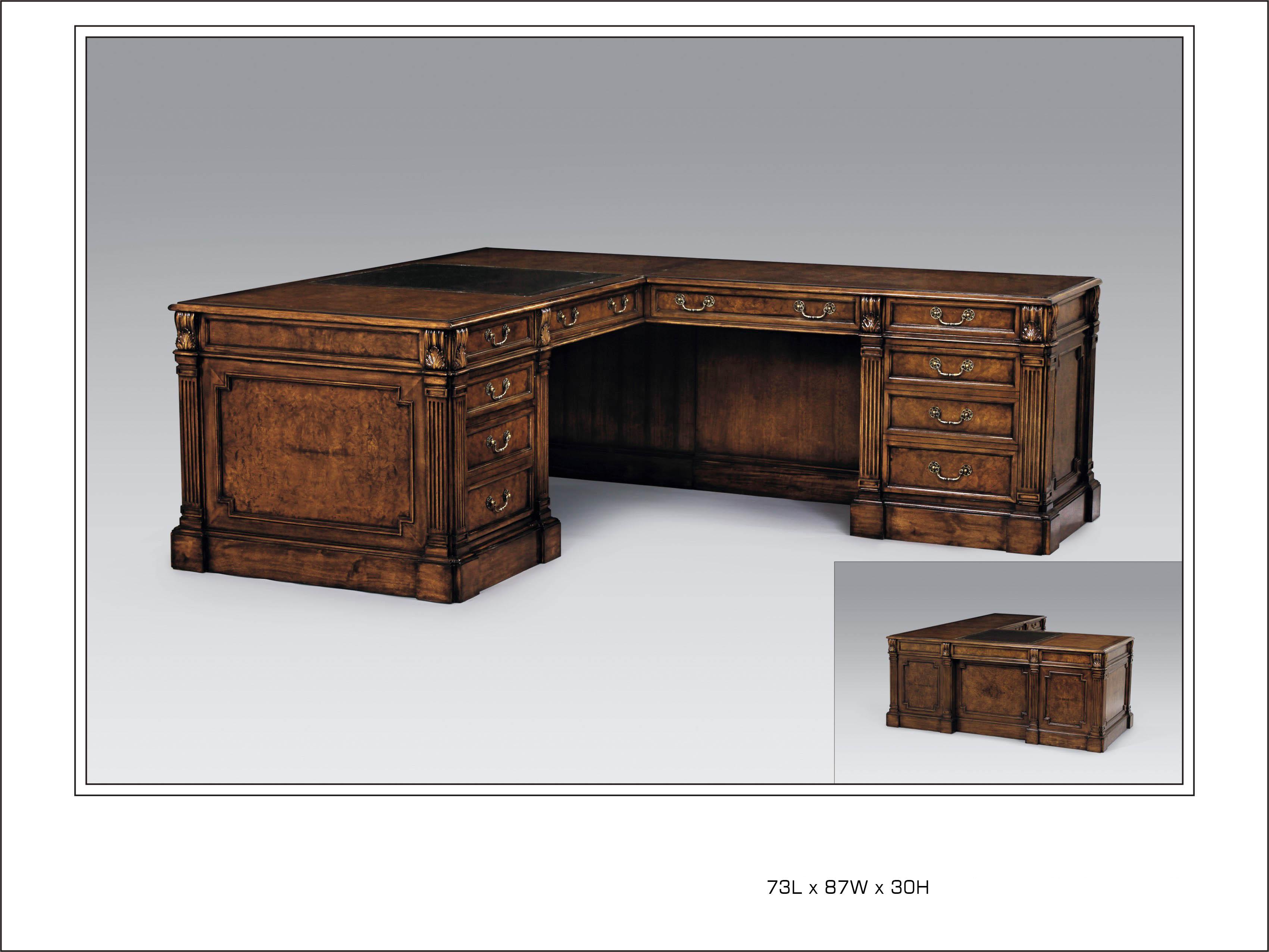 KendalMyrtle burl executive "L" desk with leather inset top. Please login to see pricing!