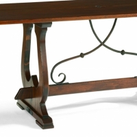 Tuscan style farm table with an unusual trestle base that has an extended stretcher and wrought detailed iron supports. The top flips open to double the surface area for dining. Closed: W71 D17 H30 Open: W71 D33 H30