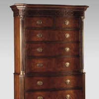 Crotch Mahogany chest on chest with brass column fitments and blind fret cornice
