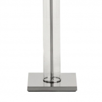 Transitional floor lamp features a columnar glass tube that surrounds a steel metal neck. Finished in polished nickel and supported by a polished nickel square foot. Topped with a white parchment drum shade. 3-way switch.