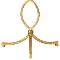 A stacked column of vertical ellipses and small rectangles in hand hammered iron are interesting…in gold leaf the design is amazing. The slick white microfiber drum shade has a top diffuser and is lined in white cotton.