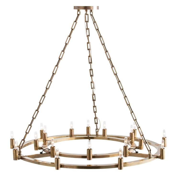 This ring-inside-a-ring brass chandelier has 18 lights and is finished in antique brass. Each of the sockets pivots 320 degrees so the bulbs can be turned at different angles.