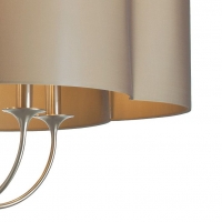 Distinctive 6-light steel chandelier in antique silver finish has sweeping arched arms topped with an olive gray scalloped edge fabric shade with taupe sheer lining.