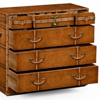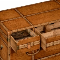 Leather and oak bound travel trunk style dressing chest with three fitted upper drawers. Three drawers beneath lined with vintage map detailing. Patinated metal fittings throughout.