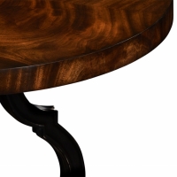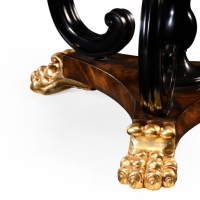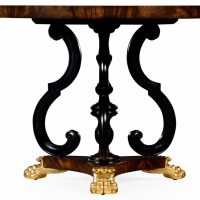 Powerfully designed crotch mahogany veneered circular center table with baluster central column and scrolling ebonised legs set on a trefoil base with finely carved and gilded lions paw feet.