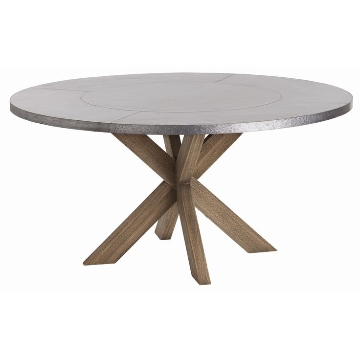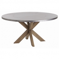 This 60" dining table is made of solid wood which has been waxed to maintain the natural color. The top has been clad in galvanized steel and attached with small nail heads in a circular pattern. Perfect dining table or as a striking entry piece.