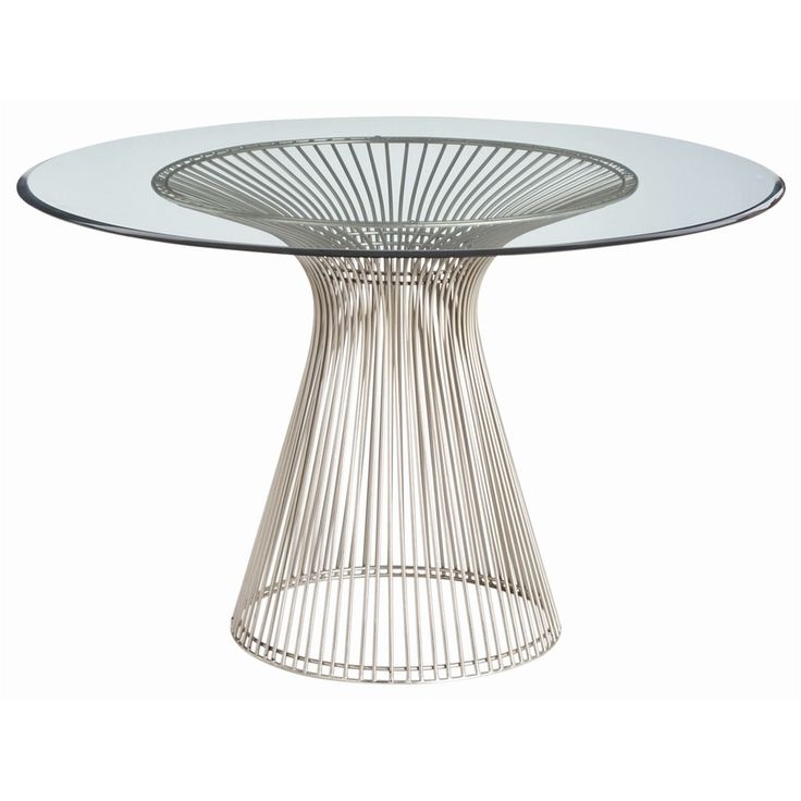 Round table with modern pedestal base made from thin iron rods in a brushed nickel finish and topped with a beveled glass top.