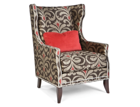 Wing Chair. Tight back, Loose seat. Shown with optional nail trim and optional contrasting fabric on a kidney pillow.