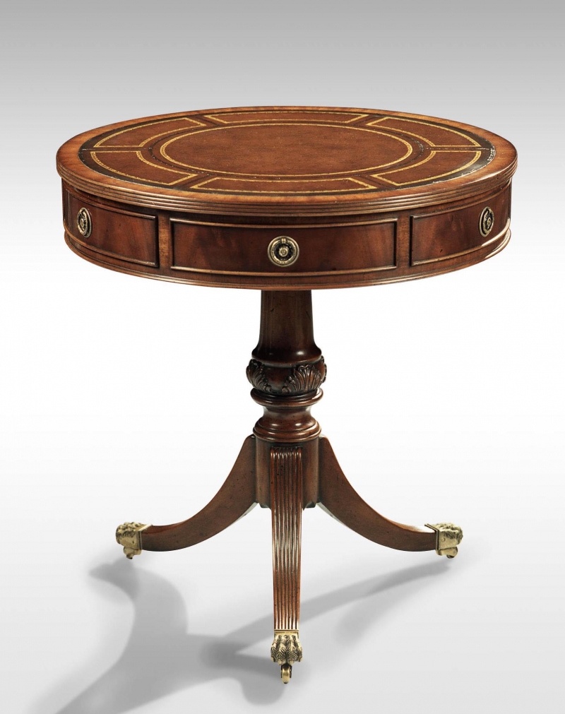 Crotch Mahogany Small Drum Table with Antique Brown Leather and Brass Accents