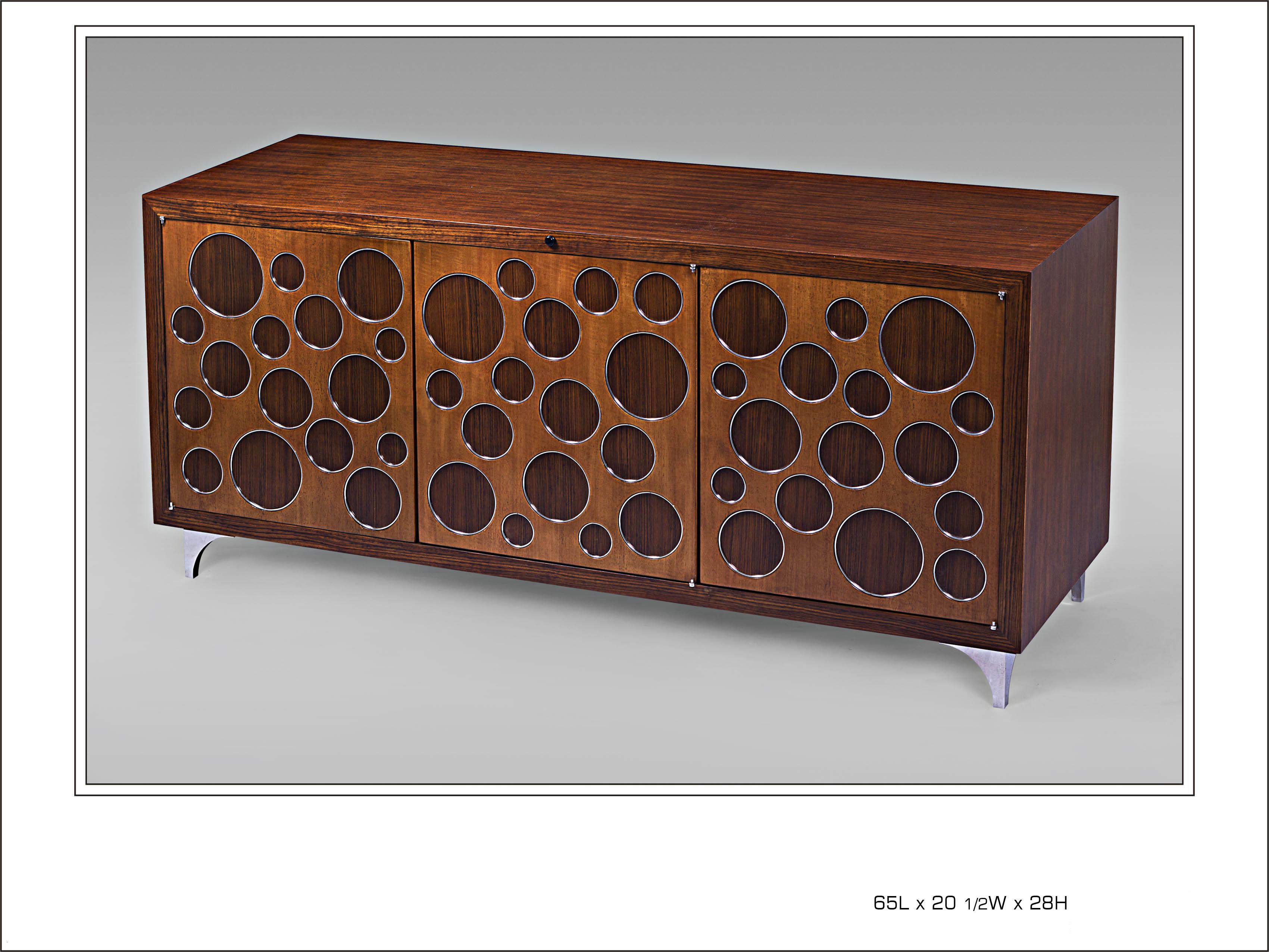 Mozambique and Anegre Veneer TV Stand with Nickel Plated Brass Accents, TV Stand Shelves, Left and Right with Central Wire Management System and DVD Drawers with Infrared Receiver Exhaust Fan and Power Strip
