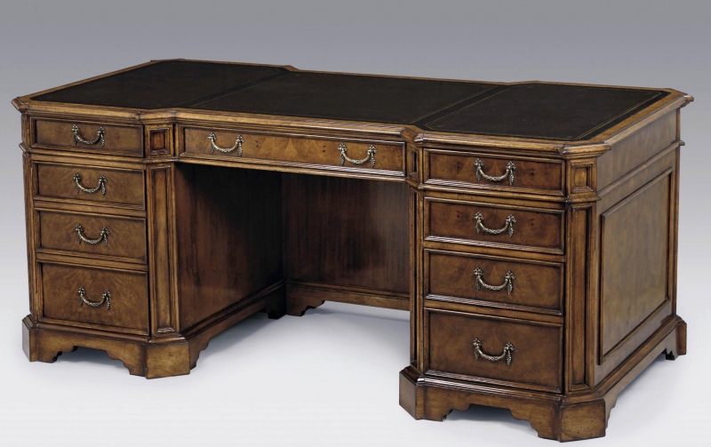 Myrtle Burl Pedestal Desk with Antique Leather Top and Brass Handles. File Drawer Left and Right.