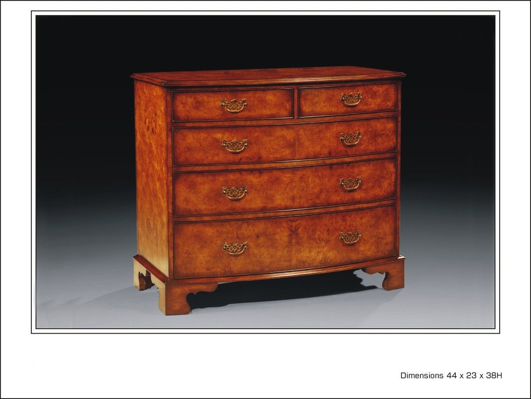 Burl Walnut Bowfront Chest with Brass Handles. Available in Mahogany.