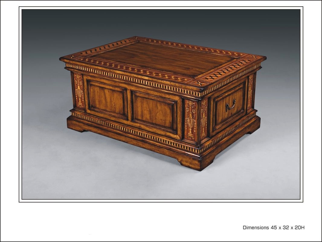 Heavily Marquetry Inlayed Small Cocktail Table with Hand Planed Raised Panels and Two Working Drawers with Brass Handles