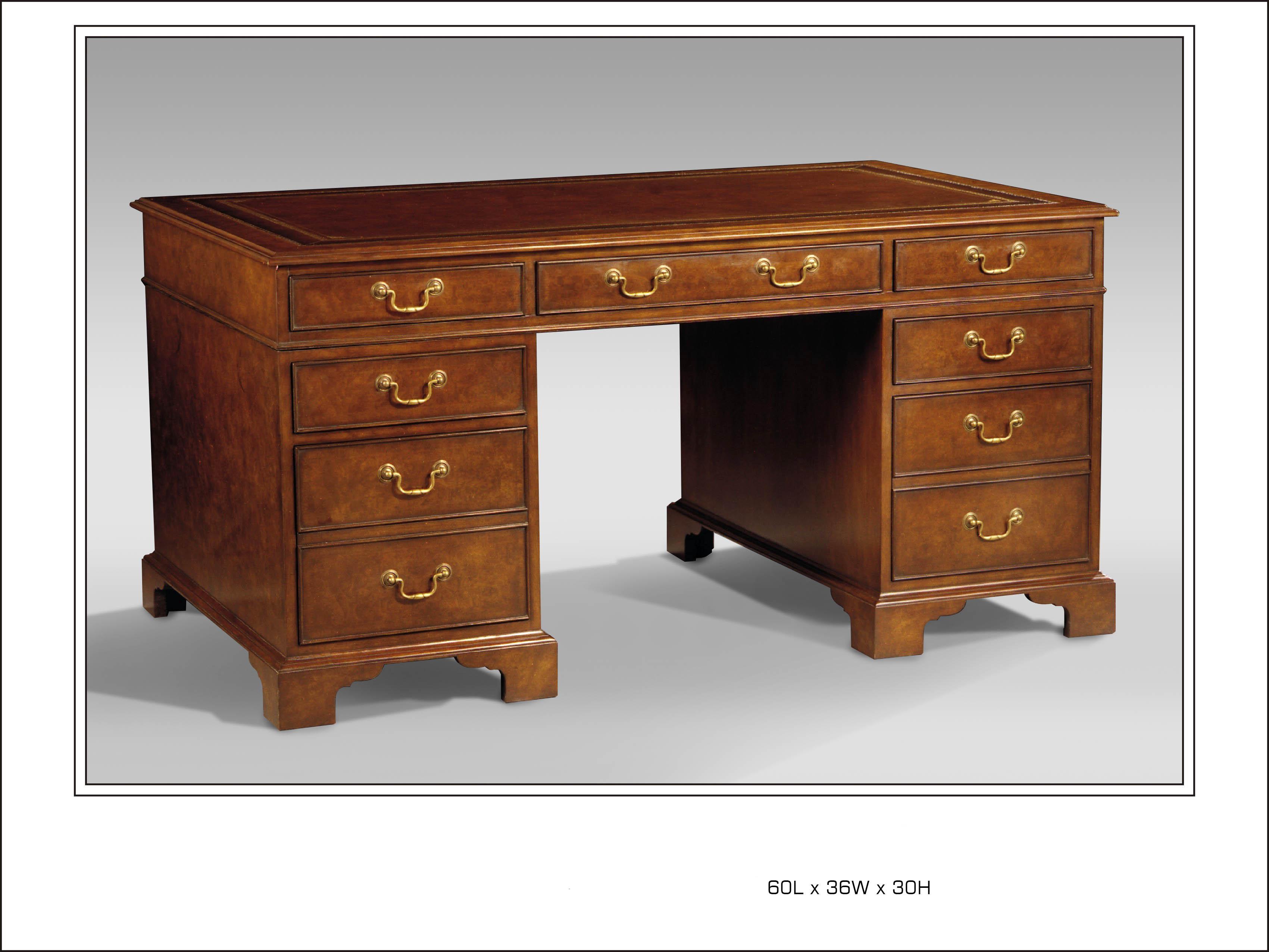 Burl Walnut Writing Desk with Antique Brown Leather Top and Brass Handles. File Drawer Left and Right. Also available in Mahogany.