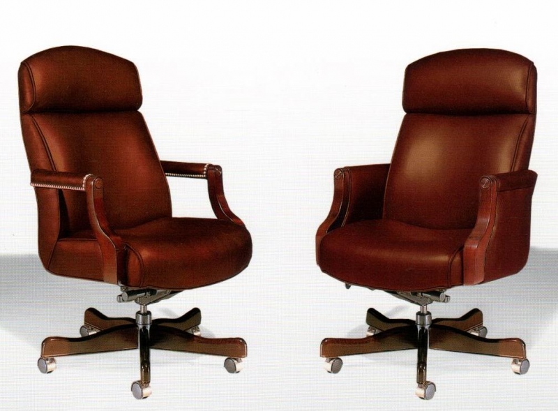 Ergonomic transitional leather executive chair. Heavily sculptured seat and back gives automotive support. Standard closed arm design with wood arm caps and gas lift knee tilt. Choice of wood finishes and covers.