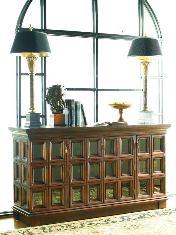 24 Individual glass panes in four hinged doors make up this elaborate cabinet designed to accommodate media components and flat screen TV.