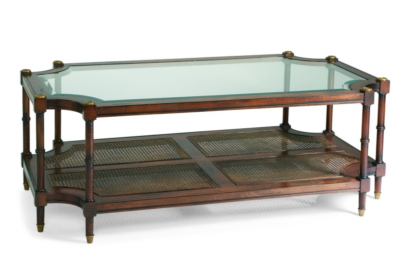 Details abound in this over-scaled rectangular glass top cocktail table. Caned lower panels, bamboo turned posts, beveled glass top and brass leg post caps and ferruled feet.