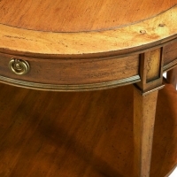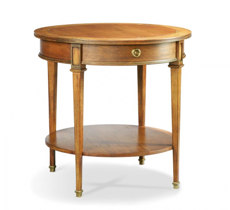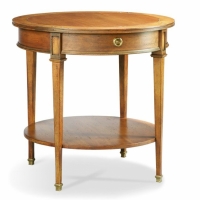 Well proportioned round lamp tale with four tapered legs with ferruled spade feet, a working drawer, and a lower shelf.