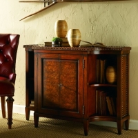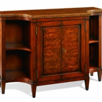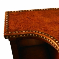 Console/bookcase featuring highly figured oak burl veneer door fronts as well as antique brown leather top and side panels with antique brass nailhead trim.