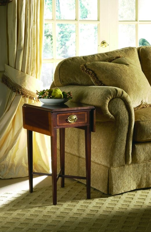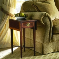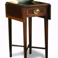 Stretcher based small scale drop-leaf end table with one working drawer and tapered legs. Mahogany solids with mahogany and prima vera veneers.