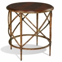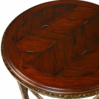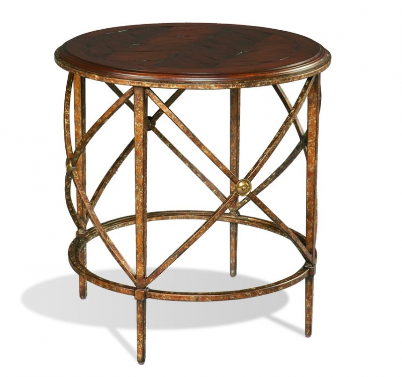 Beautiful artisan crafted wrought iron round lamp table in an aged bronze finish with a heavily antiqued herringbone patterned walnut top. Antique brass medallion on x-brace and inset glass shelves.