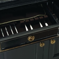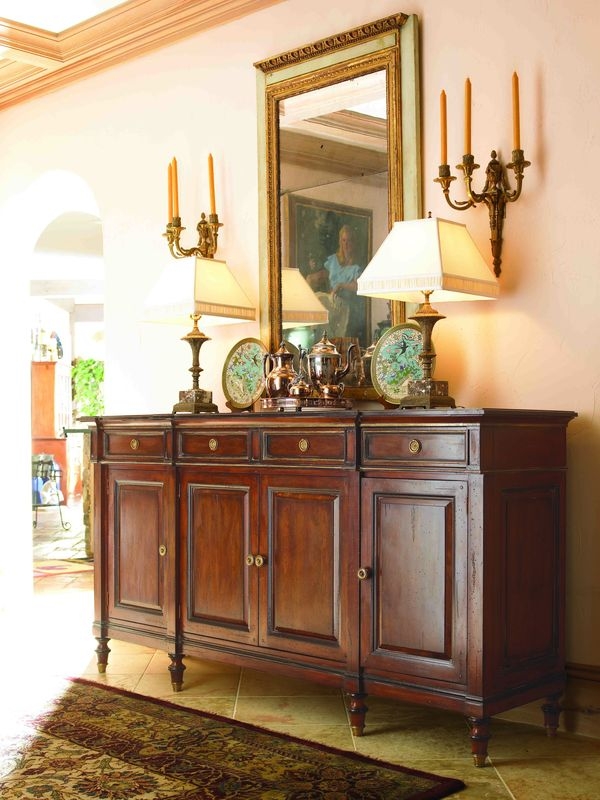 Large Buffet/Credenza Silver liners in center drawers, line pads in outside drawers, two tray drawers behind center doors, three adj. shelves, brass ferrules. 80 3/8 x 22 x 42 3/4H