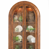 Glazed doors with key and backplate pulls, glazed ends, three adjustable wood frame with glass insert shelves, 2 puck touch light system, wood back panel.