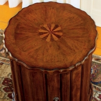 Selected solids and choice veneers. Hand carved details. Maple, walnut and cherry veneer inlay top. Door with antique brass plated hardware.