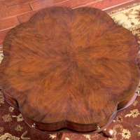 Selected hardwoods and choice veneers. Hand carved details. Veneer inlay top with end grain border. Two working drawers. Antique brass finished hardware.
