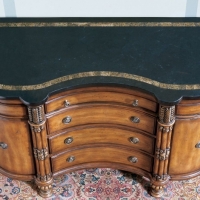 Selected solid woods, choice veneers and resin components, hand carved details. Top is black fossil stone with snake skin fossil stone insert. Six drawers and two doors with antique brass plated hardware.