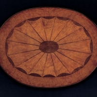 Made from selected solid wood and choice cherry veneers. Maple and walnut inlay. Unique design with burnished pattern lines. Delicately designed legs. Lower storage shelf. Working drawer. Brass plated hardware.