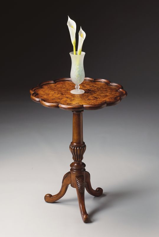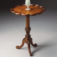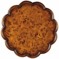 Selected solid woods and choice ash burl veneers. Four-way matched veneer top with pie crust frame. Resin appliqués.